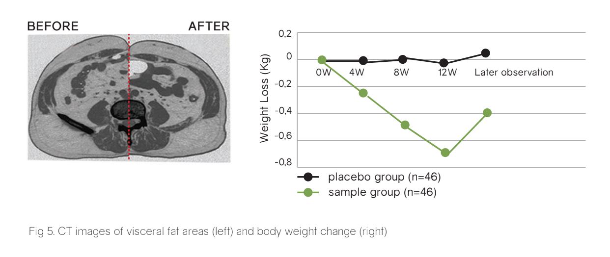 Applephenon® reduced visceral fat by 8–9 cm² (observed via CT scan), waist size by ~2 cm, and body weight by nearly 1 kg over 12 weeks — while placebo showed no change.