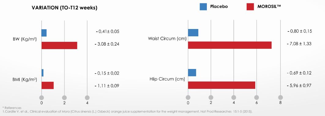 Morosil® supplementation with 400 mg of extract on 30 healthy volunteers (BMI 25-35 Kg/m2) showed to induce a significantly reduction of body weight, BMI, waist and hip circumference after a period of treatment of 12 weeks